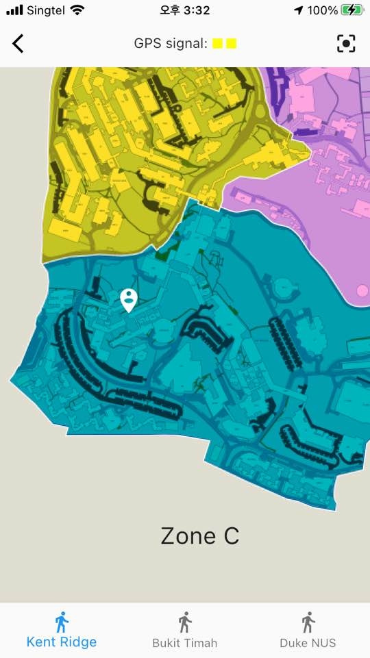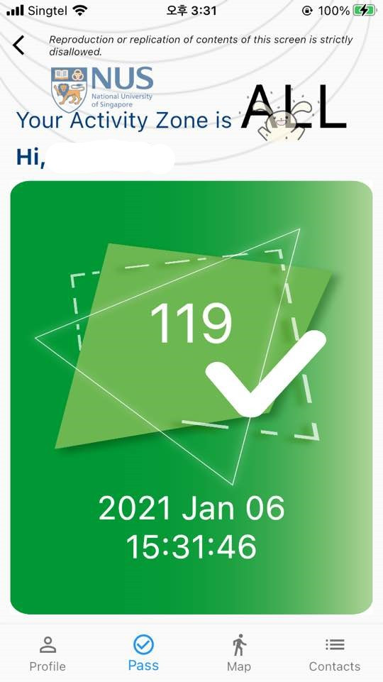 학교는 교직원, 학생들의 동선을 관리하고 이동을 통제하기 위하여 휴대폰 앱을 적극적으로 이용했다. NUS 구성원 모두가 캠퍼스에 오기 전 해당 앱을 통해 증상과 체온을 기록해야 했다. 대면 수업 등으로 캠퍼스에 방문하는 것이 허용된 날일 것, 증상이 없고 체온이 정상적일 것, 소속 구역 안에 있을 것 등 몇 가지 조건이 충족되면 앱에서 그린 패스 (green pass)를 얻을 수 있었다. 스쿨버스를 타거나, 학교 내에서 음식과 음료를 구매하거나, 도서관에 입장하는 등 학교에서 거의 모든 행위를 할 때 이 그린 패스가 필요했다. 새 학기가 시작된 지 얼마 되지 않아 내가 속한 사회과학대에서는 대학원생 중 논문 트랙으로 입학한 연구생 (research student)들은 홀수/짝수 학번으로 나누어 면대면 수업이 없어도 각각 월, 수, 금 또는 화, 목, 토에 캠퍼스를 방문할 수 있게 조정해 주었다. 캠퍼스가 열리기 시작하며 나도 학과로부터 연구실 공간을 배정받았다. 그러나 도서관, 연구실, 식당, 카페 등 학교 내 모든 시설은 거리두기를 계속해서 엄격하게 준수했으며, 비워두어야 할 책상과 의자에는 테이프로 표시된 커다란 X자를 쉽게 찾아볼 수 있었다.