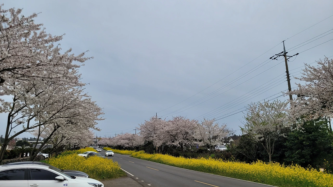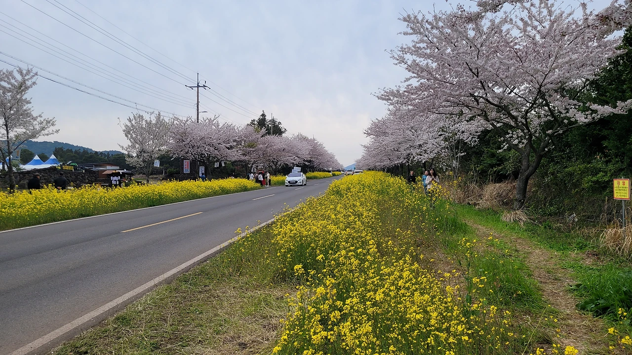 근처 슈퍼에서 군것질거리를 사서 서귀포로 가는 길... 길가에 유채와 벚꽃이 만발을 한 것이다.