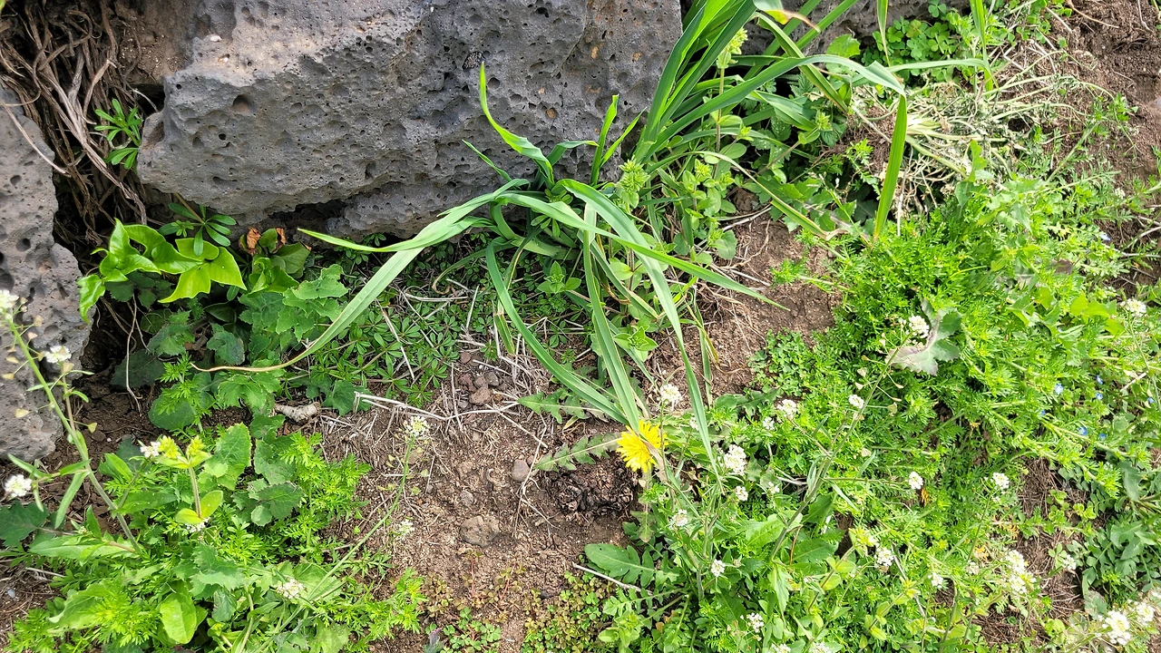 돌담 흙길에 꽃피운 꽃을 보며, 경이로워하고.. 그렇게 30분도 채 안되어서 산책을 마친 뒤에..