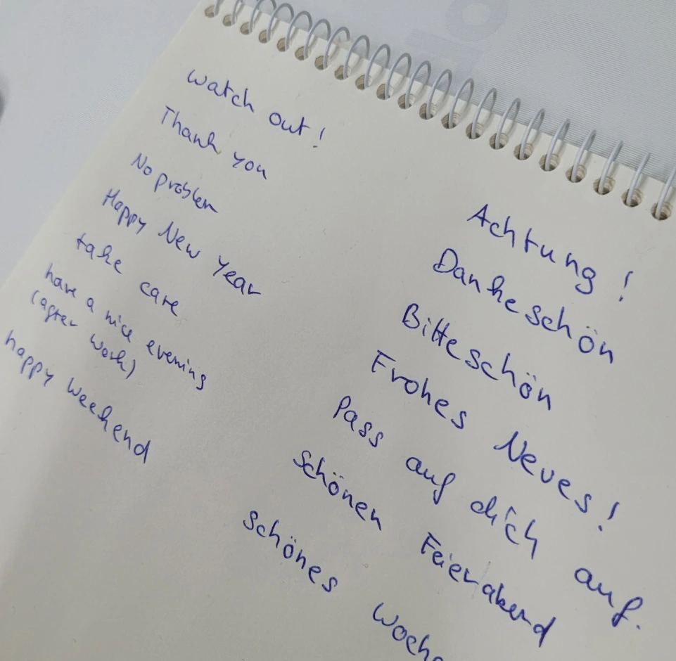 동시에 나는 그녀에게 같은 말로 한 두개의 독일어 기초 단어와 인사말, 간단한 표현 등을 익힌다.