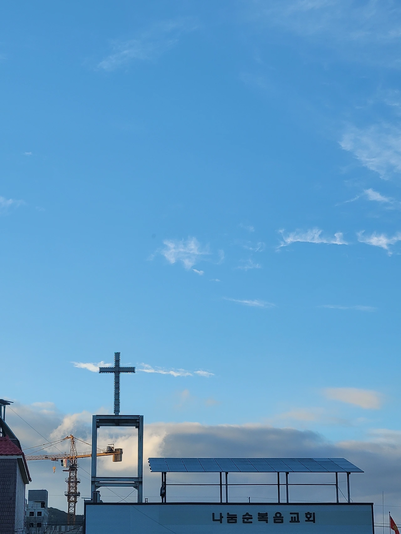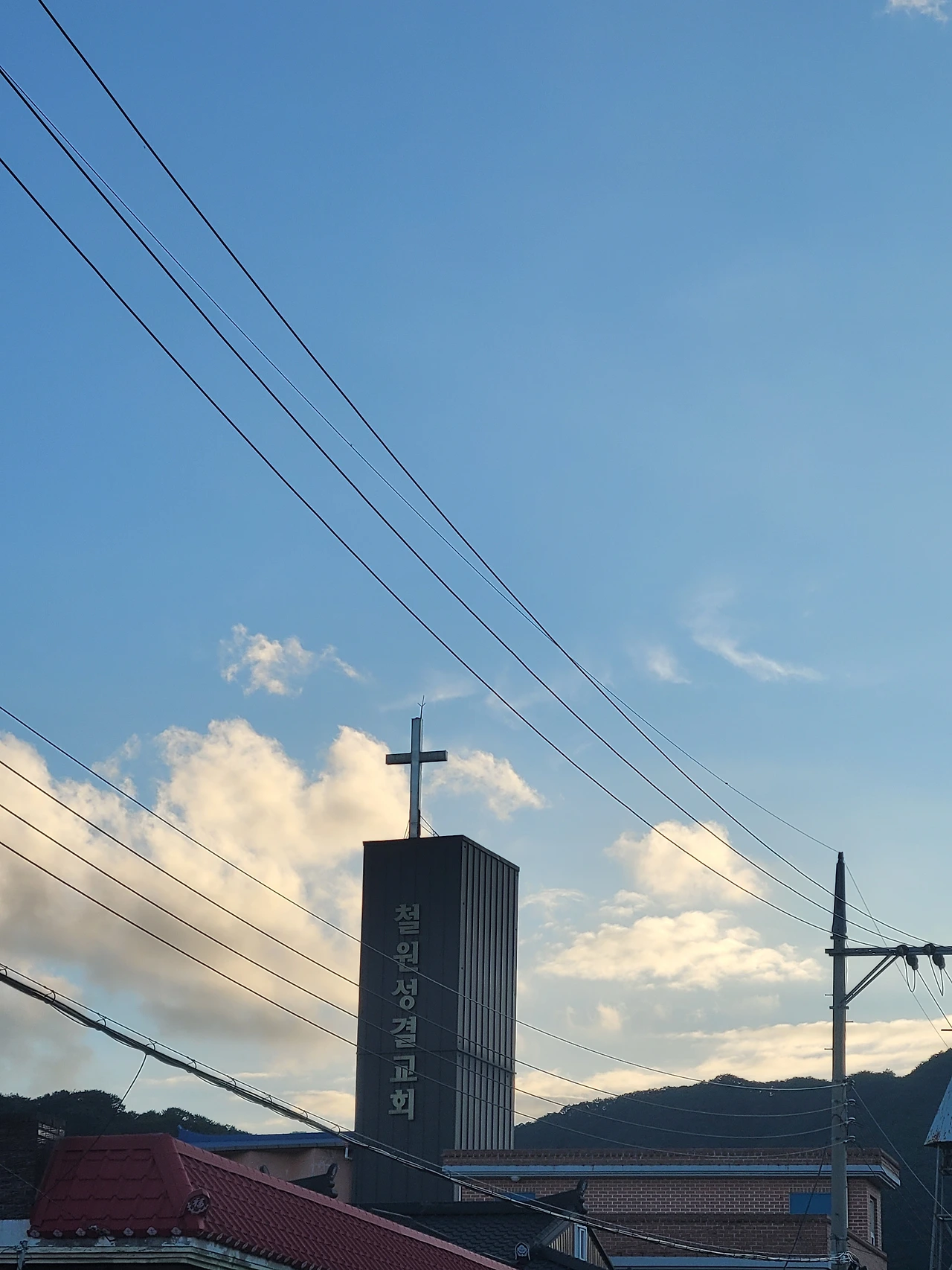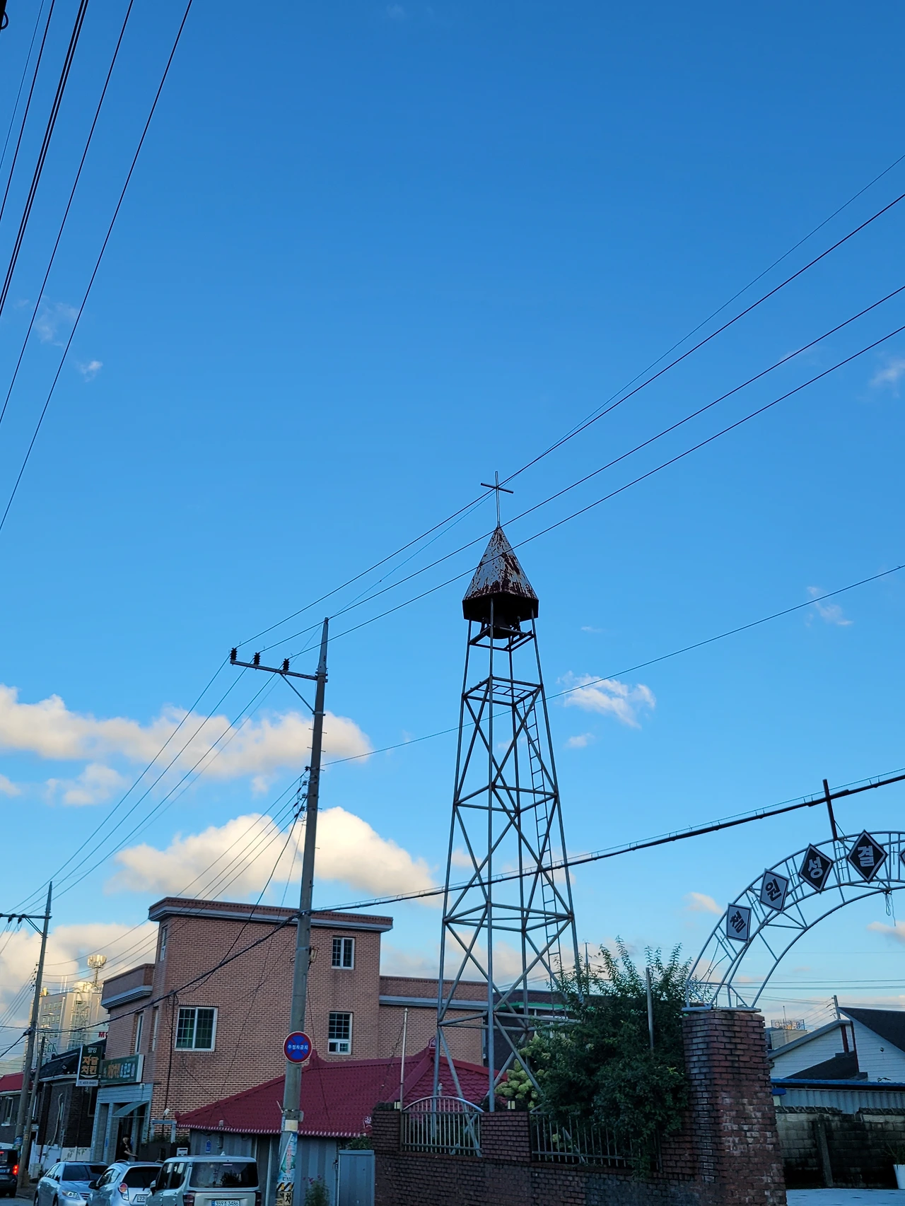 산책하는 시간 파란 하늘 아래 교회 십자가가 여러개 보입니다.
