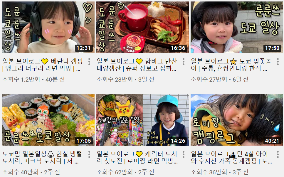 다섯 살 된 딸, 남편과 함께 일본에 살고 있는 한국인 가족의 이야기인데, 여기엔 내가 좋아할 수밖에 없는 세 가지가 모두 나온다. 바로 요리, 어린이, 해외 살이다. 요리는 직접 하는 것도 좋아하지만 요리하는 모습을 보는 것도 좋아하는데, 요리를 알려주는 영상보단 그저 지켜보는듯한 영상이 좋다. 서울에서 혼자 직장을 다니며, 요리를 할 수 있는 시간도 줄어들고 먹어 줄 가족들도 없다 보니 따뜻한 집밥을 나눠먹는 모습을 보는 걸로 대리만족을 하는 것 같기도 하다. 그래서 처음엔 아침 도시락 싸는 영상을 보다 계란말이 마는 장면에 중독돼 어느새 계란말이 특집 영상을 보고 있더니, 그다음엔 이름도 귀여운 로미에게 빠져 랜선 이모가 됐다. 로미는 에너지가 넘쳐서 활어짱이라는 애칭이 있는 다섯 살 꼬마 아이인데, 잘 먹는 모습도 귀엽고 웃는 모습도 귀엽고 말솜씨가 늘어가는 모습도 귀엽다. 빨리 결혼해서 애를 낳아야겠다는 결심까진 아직 안 생기고 조카가 생겼으면 좋겠다. 그리고 영상 중간중간 엿볼 수 있는 일본의 풍경. 일본의 마트엔 저런 게 있구나, 주차장은 저렇게 생겼구나 하면서 한 번도 안 가본 일본 여행을 침대에서 하고 있다.