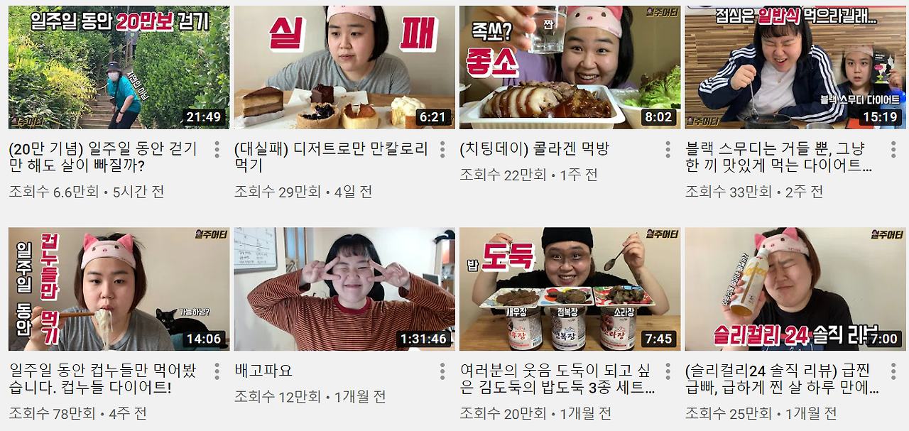 나는 평생을 크게 찐 적도 빠진 적도 없이 살아온 유지어터인데, 최근 들어 부쩍 다이어트에 관심이 많아졌다. 일주어터는 운동은 거의 안 하지만 괜히 운동 영상도 몇 개 찾아보고, 식단 영상도 기웃거려 보다가 알게 됐는데 요즘 나의 다이어트 메이트이자 내가 아는 100kg 중에 제일 예쁜 언니이다. 나이는 잘 모르지만 멋지니까 언니다. 여러 가지 식단 다이어트를 일주일씩 도전해 살이 빠지는 과정을 보여주고 장단점을 소개해 주는 컨텐츠인데, 배고픔을 참아가며 식단을 정말 제대로 지키고 그만큼 살도 쭉쭉 빠지는 모습을 보여줘서 보다 보면 도전 의지를 불러일으킨다. 그런데 그렇게 다이어트를 잘하는데 놀랍게도 수많은 영상 속 도전 시작 몸무게는 100kg이다. 회복이 참 빠르지만, 그래서 더 정감 가는 채널이다. 또 다이어트하는 모습을 낱낱이 보여주는 설정처럼 성격도 아주 쿨하고 유쾌한데, 나는 새로운 시작을 할 때 고민이 너무 많고 다른 사람들을 신경 쓰는 소심쟁이라서 저렇게 솔직하게 자신을 보여주는 사람들이 멋져 보이고 호감이 간다.
