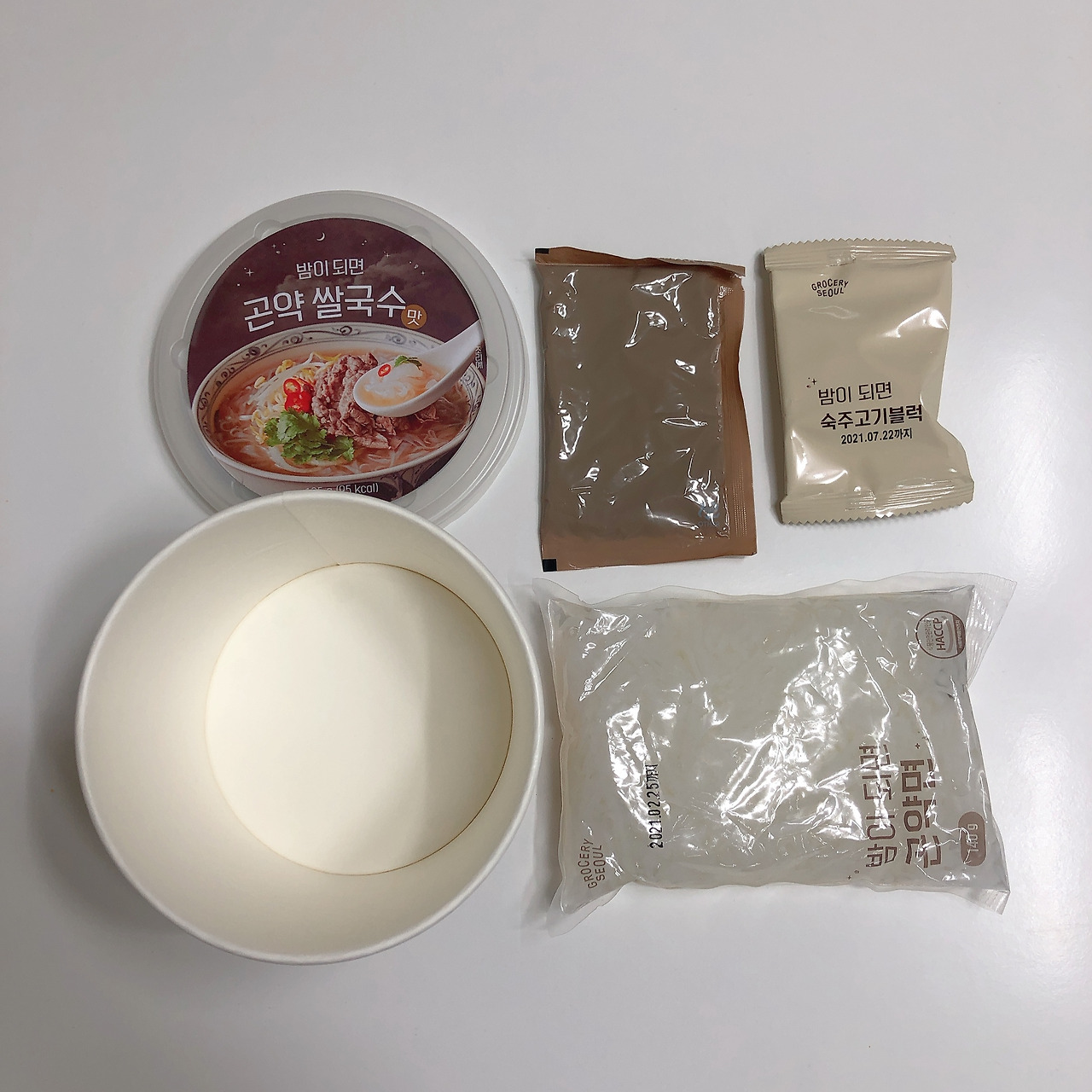 이것도 역시나 시키는 대로 다 넣고 전자레인지에 돌리면 된다. 쌀국수엔 숙주가 빠지면 안 되니까 숙주를 듬뿍 추가해서 넣었다. 숙주 블럭이 들어있어 없는 것보단 낫겠지만 양이 정말 귀여워서 마트에서 사다 잔뜩 넣고 먹으면 좋다. 고기도 한 점 있으면 좋을 것 같아서 냉동실에 있던 닭가슴살 스테이크 잘라서 올렸다. 그리고 이 날 따라 배가 많이 고파서 삶은 계란도 올렸다. 다 넣었더니, 국물이 표면장력을 자랑한다. 아무리 극소소 다이어트라지만 너무 욕심이 많아 보여서 조금 부끄러웠다. 국물을 쏟지 않게 조심조심 먹었는데, 맛이 제법 깊다. 뜨끈하니 국물 한 사발 하니 푸짐하니 좋았다. 솔직히 면은 탄수화물의 푸근한 맛이 없어서 하얀 면이 조금 그립긴 했지만, 집에서 먹으니 숙주를 아주 잔뜩 먹을 수 있어서 맛있는 한 끼였다. 냉장보관이 아니라 실온 보관이라, 냉장고 자리 걱정 없이 쟁여 놓기도 좋다.