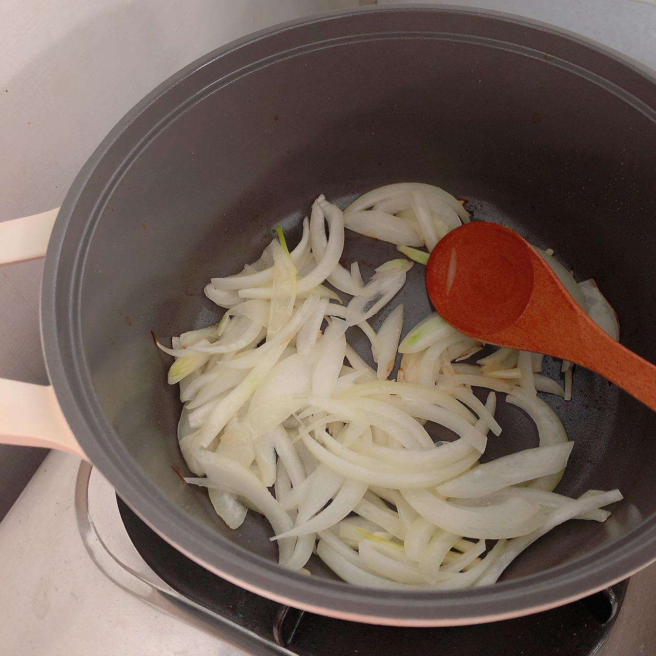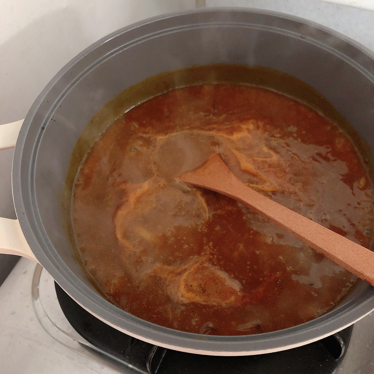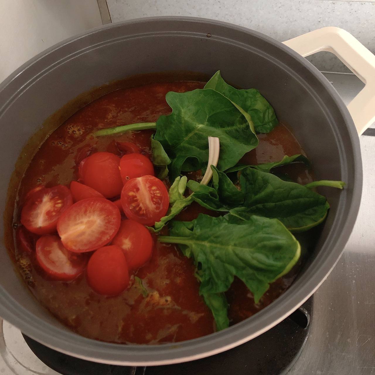 냄비에 양파를 볶다가 물과 카레를 넣고 끓인다. 카레가 끓으면 토마토와 시금치를 넣어 휘휘 섞고 일분 정도 더 끓여주면 완성! (카레는 어떤 제품을 사용하던 다 맛있다.)
