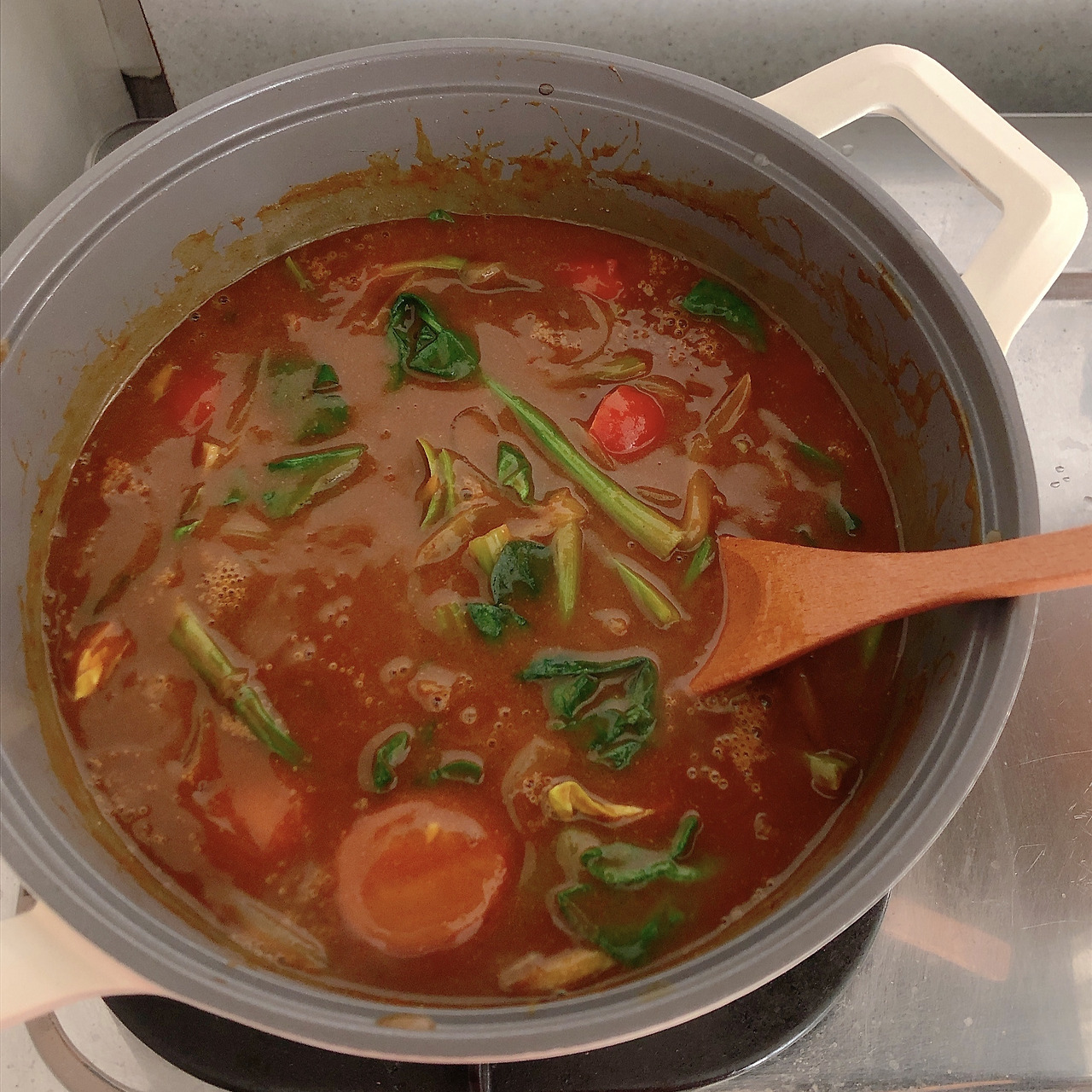 그런데, 귀찮음은 이겨 내기가 힘들다. 채소들이 또 상할 위기에 처했다. 그래서 급하게 간단하지만 맛있고, 좋은 재료들이 듬뿍 들어간 간단 카레 레시피를 꺼내본다. 십분 완성 토마토 시금치 카레. 온센다마고 추가도 됩니다!