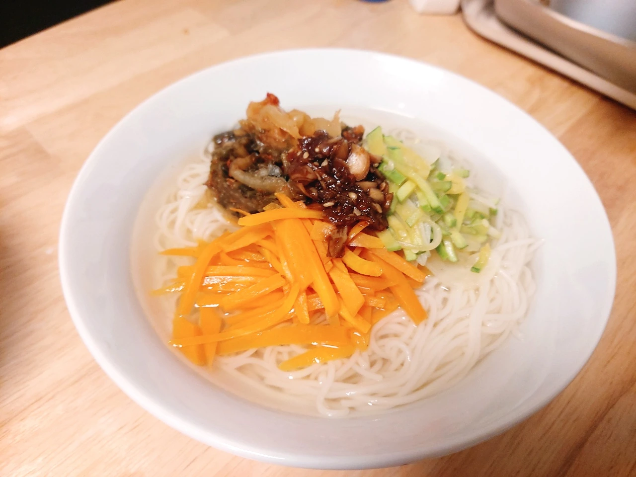 냉장고에 있는 야채와 멸치를 넣고, 잔치국수 육수를 만들었다. 당근, 애호박, 김치를 실하게 채 썰어, 잘 복아 고명도 만들었다. "그냥, 먹자! 역시, 뭔가 꼬인 거 같을 때는 국수가 최고다! 최고야!!" , "이 맛에 잔치 국수를 끓이는 거 아니겠어!!" 라며.