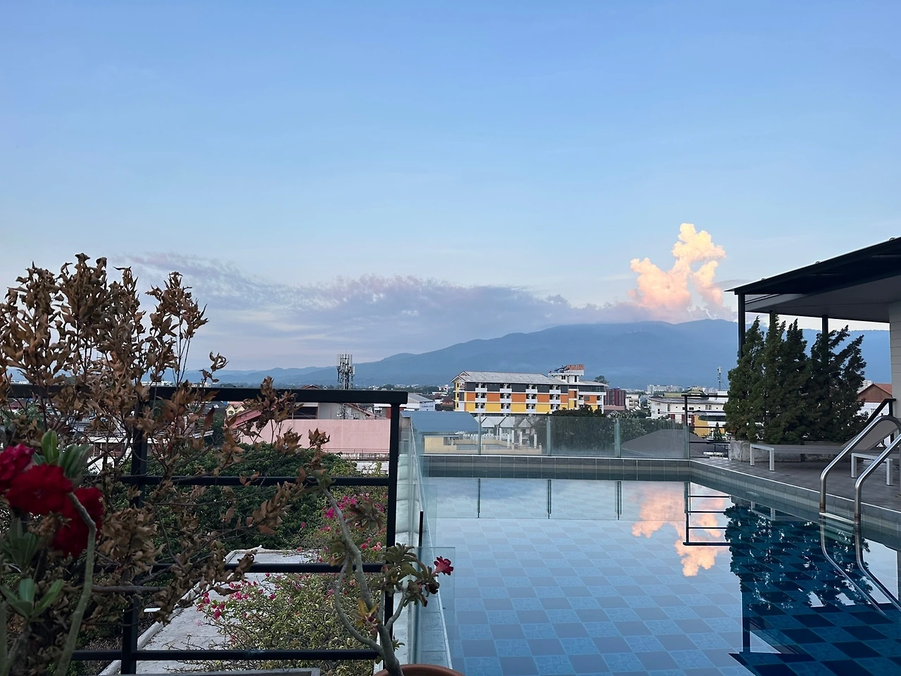 태국 치앙마이에서 머물렀던 1달 중 딱 한번 비가 오는 날이 있었는데, 나는 그날 수영장에 있었다. 그날은 태국 요리를 배우기 위해 치앙마이 근교의 농장에 다녀온 터라, 더위를 식히고 싶어 오후 3시 즈음 옥상 수영장으로 갔다. 내가 도착한 후 얼마 뒤 먹구름이 끼면서 비가 내렸다. 매일 화창한 이곳도 비가 오는 날이 있구나! 하며, 수영장에 떨어지는 빗물들이 만드는 둥근 움직임을 신기하게 쳐다보곤 했다.