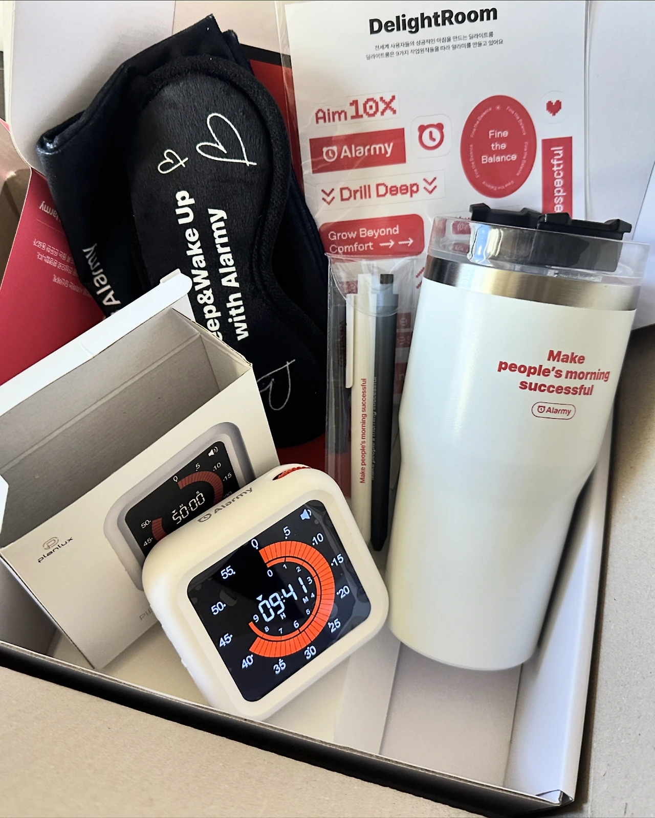 나의 소식을 들은 지인은 내게 '아침 루틴'습관을 잡을 수 있도록, '알림이(생산성) 애플리케이션' 프리미엄 서비스를 한 달 동안 사용하고, 블로그나 SNS에 기록하면 소정의 상품을 주는 서포터즈 활동을 해보라고 권해줬다. 지인에게 관련 링크를 받고, 신청글을 쓴 나는 얼마 뒤... 알림이 팀으로부터 웰컴킷을 받았다. 첫 번째 주 미션이 평소보다 10분 일찍 일어나서 나만의 아침 루틴을 설정하고 해 보는 것인데, 생각만 하고 모두 실패한 것 같다. (다음 주에 하면 재도전하면 되겠지...)