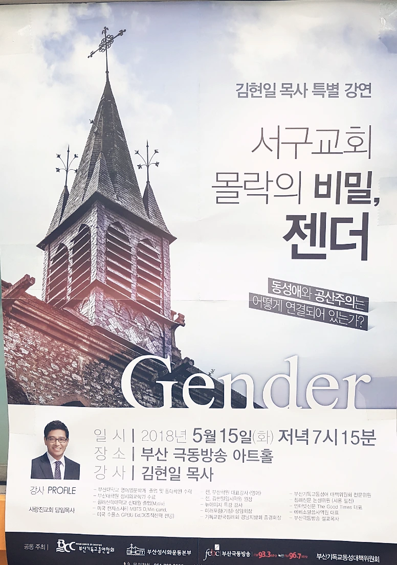 큰 교회연합체들에서는 종종 '동성애 혐오 강연'도 연다. 한번도 들어본 적은 없지만 풍문에 의하면 목사라는 사람이 나와서 동성애를 왜 하면 안되는지에 대해서 몇시간에 걸쳐서 떠든다고 한다. 재단이 보수적인 기독교인 대학에서는 '채플'이라는 성경수업에서 노골적으로 '항문섹스' '에이즈' 등 자극적인 표현을 써가면서 동성애 혐오를 조장한다. 위 포스터에 있는 강연은 단순히 '동성애 혐오'를 넘어서 동성애가 공산주의와 연결되어 있다고 주장한다. 제일 큰 제목은 서구 교회의 몰락이다. 종합해보자면 서구사회의 교회들이 몰락했는데, 이는 동성애와 공산주의의 영향이다 고 생각하고 있음을 알 수 있다.
