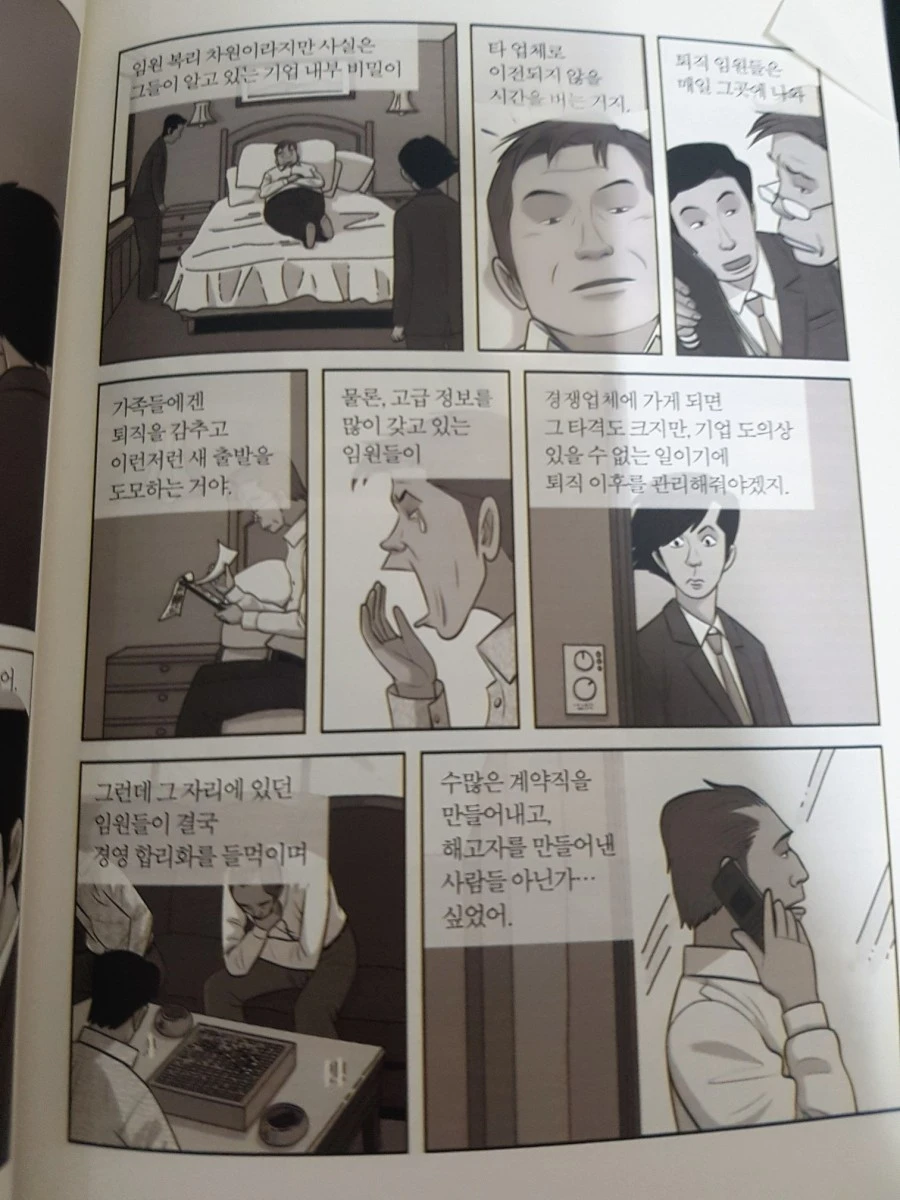 "물론, 고급 정보를 많이 갖고 있는 임원들이 경쟁업체에 가게 되면 그 타격도 크지만, 기업 도의상 있을 수 없는 일이기에 퇴직 이후를 관리해줘야겠지. 그런데 그 자리에 있던 임원들이 결국 경영 합리화를 들먹이며 수 많은 계약직을 만들어내고, 해고자를 만들어낸 사람들 아닌가 싶었어." 은퇴한 기업의 고위 간부들이 기업 기밀을 누설하도록 하지 않기 위해서 회사 돈으로 스위트룸에 월급을 주어가면서 사후 관리를 하는 모습이다. 이들이 이런 식으로 아무런 일을 하지 않으면서도 엄청난 돈을 쥐어나가기 때문에 새롭게 일을 해야할 사람은 일자리를 구하지 못하고, 지금 일을 하고 있는 사람들은 자리를 비우게 된다. 이것이 현실에서도 벌어지는 일인지는 모르겠지만, 회사가 아무리 어려워도 임원들이 배당금 잔치를 했다는 뉴스를 심심치 않게 들려오니 아예 거짓말 같지는 않다. 뉴스에 나오는 공식적인 임원들 말고도 더 많은 임원들의 입으로 더 많은 돈이 흘러간다. 그 속에서 수 많은 노동자들의 삶이 파괴된다.