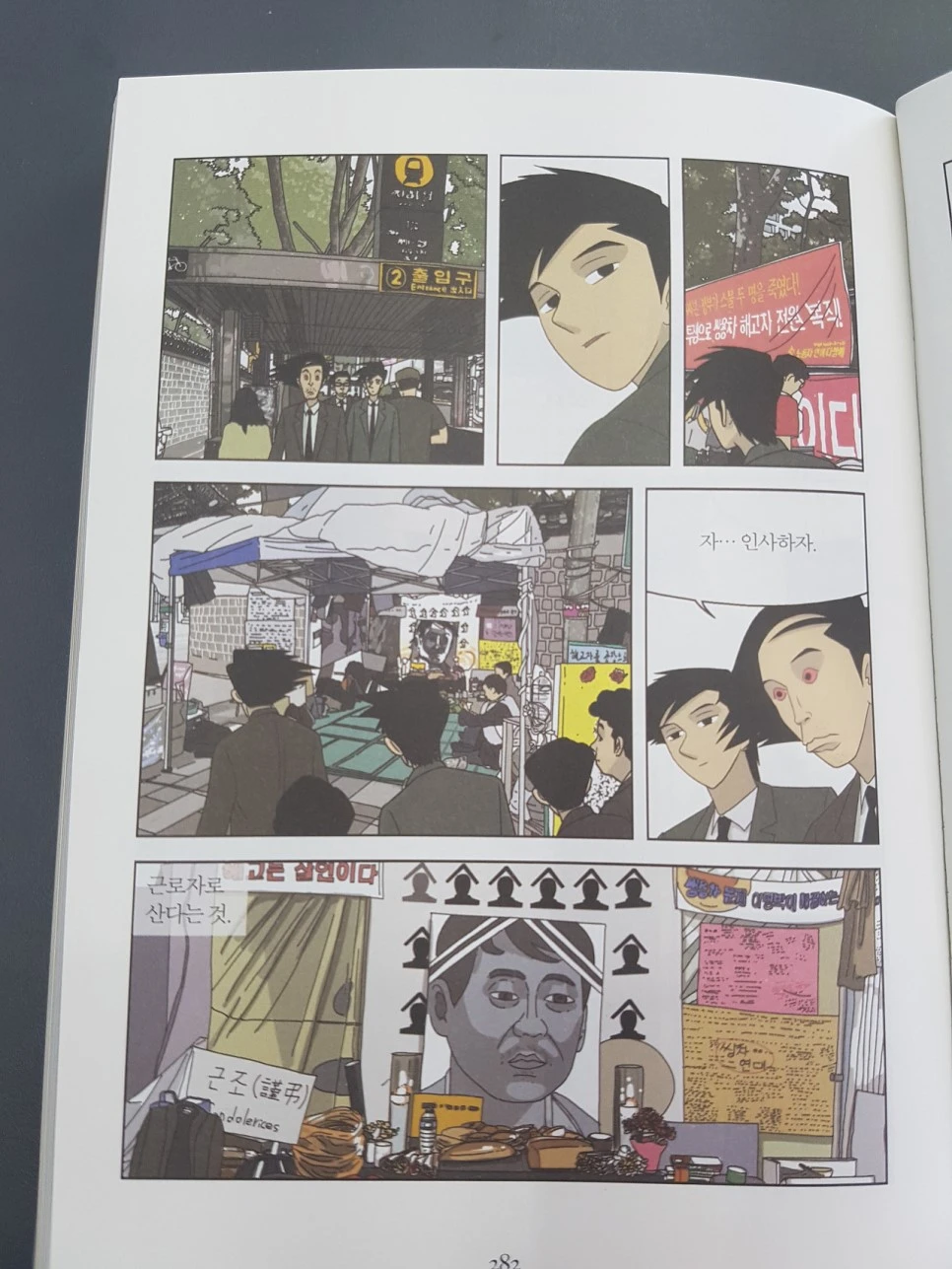 '근로자로 산다는 것.' 늘 죽음을 등에 얹고, 자신도 죽음과 마주할지 모른다는 공포 속에 살아가는 것. 무기력한 눈으로 서서히 죽어가던, 붉은 눈으로 더 빠르게 죽음으로 달려가던 이런 세상에서 근로자들의 삶은 모두 '죽음'으로 수렴한다. 죽음을 넘어서서 희망과 행복이 '노동'에 가득하길 바란다.