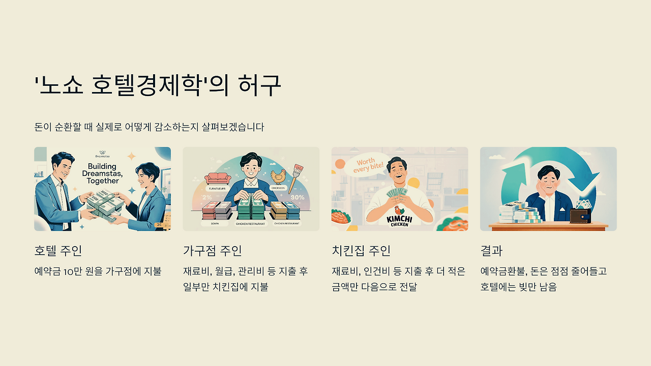 호텔에 10만 원을 냈는데, 그 돈이 가구점, 치킨집, 문방구를 거쳐 다시 호텔 빚을 갚는 데 쓰였다가, 결국 호텔 예약 취소로 다시 나에게 돌아온다는 이야기. 언뜻 들으면 마을에 돈이 돌고 경제가 살아나는 것처럼 보입니다. 이걸 '노쇼 호텔 경제학'이라고 부른다네요. 하지만 잠깐! 뭔가 이상하지 않나요?
