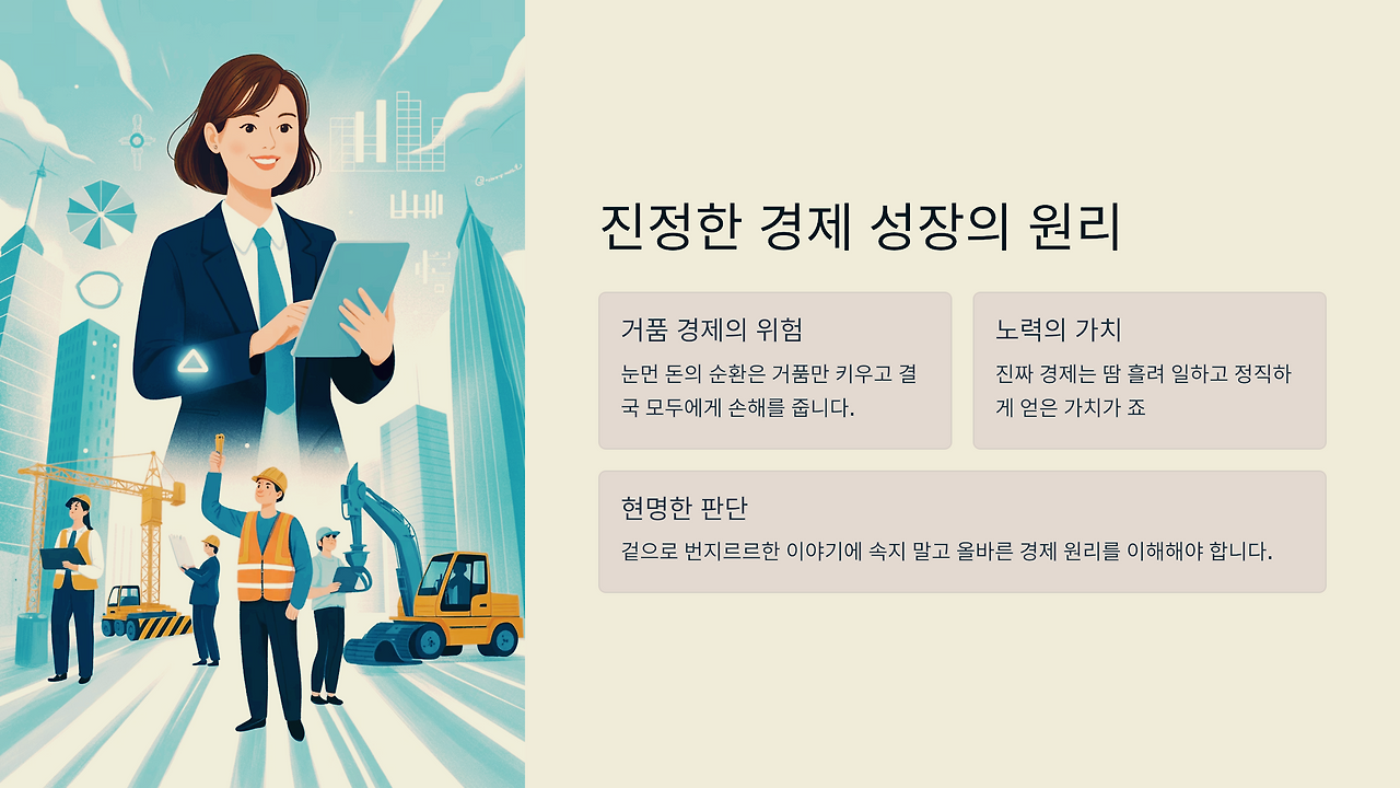 겉으로만 번지르르한 이야기에 속지 마세요. 우리 사회의 경제는 이런 눈먼 돈의 순환이 아니라, 땀 흘려 일하고 정직하게 얻은 가치가 쌓여서 성장하는 것입니다. 진짜 경제를 이해하고 올바른 판단을 하는 것이 중요합니다.