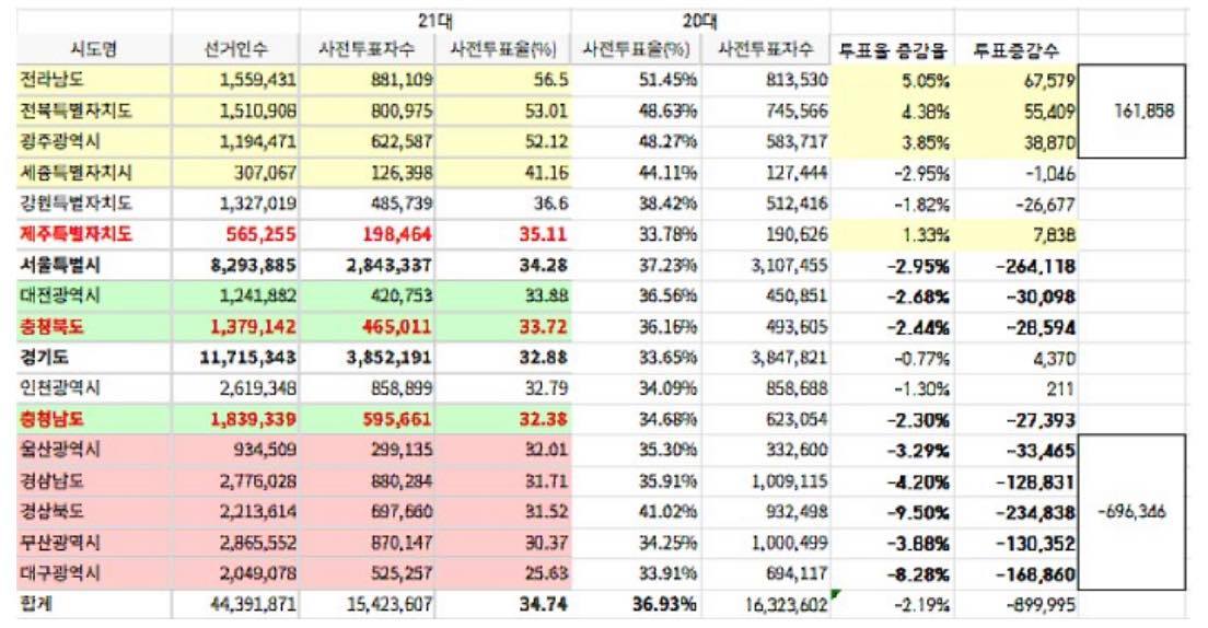 최근 사전투표에서 영남권 투표율이 전국 평균보다 4% p, 호남에 비하여 약 24% p 낮았지만, 이는 오히려 본투표에서 보수 지지층의 강력한 결집을 기대하게 하는 신호입니다. 과거 선거에서도 보수 지지층이 대거 결집하여 투표율이 높아질 때, 예상을 뛰어넘는 압도적인 결과가 나왔던 사례가 수없이 많습니다.