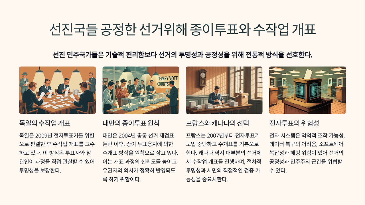 공정한 선거를 위해 많은 선진국은 여전히 수작업과 검증 가능한 방식을 고수한다. 이는 전산화나 데이터화가 지닌 조작 용이성과 검증의 어려움이라는 본질적인 문제를 극복하기 위함이다.