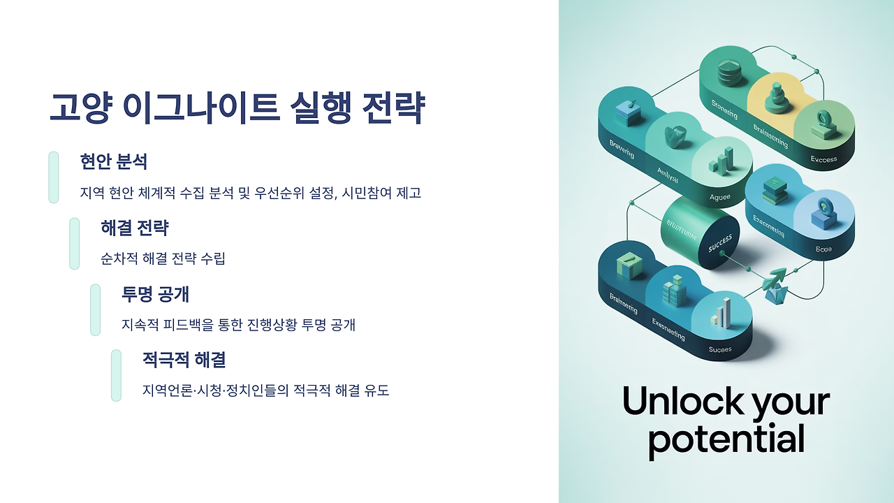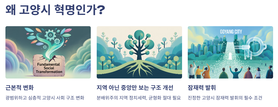 고양시 국회의원들이 중앙 정치의 논리에서 벗어나, 지역의 고유한 성장 동력을 발굴하고 균형적인 발전을 이끌어내는 데 역량을 집중할 때 비로소 고양시는 진정한 잠재력을 꽃피울 수 있을 것입니다. 이것이 바로 고양 이그나이트가 추구하는 지역 혁명의 본질이며, 시민 여러분의 적극적인 참여와 관심이 이 혁명의 성공을 좌우할 것입니다.