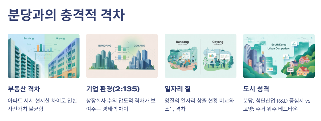 이러한 문제는 구체적인 수치로도 명확하게 드러납니다. 고양시와 비슷한 시기에 개발된 분당과 비교해 보면 그 격차는 더욱 뚜렷해집니다. 분당의 아파트 평균 시세가 고양시보다 현저히 높은 것은 물론, 분당이 있는 성남시에 본사를 둔 상장회사의 수(2:135)나 양질의 일자리 창출 현황에서도 고양시는 크게 뒤처져 있습니다.