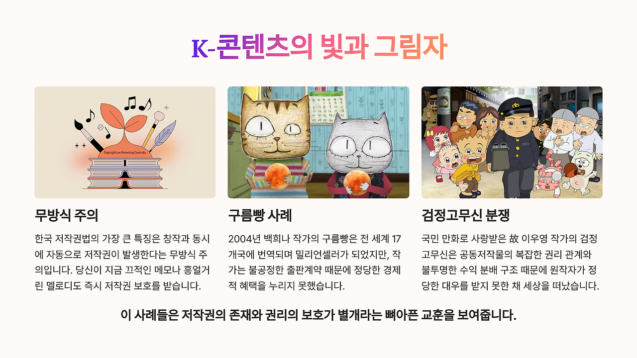 더 가슴 아픈 사례는 故 이우영 작가의 검정고무신 분쟁입니다. 국민 만화로 사랑받은 작품이었지만 공동저작물의 복잡한 권리 관계와 불투명한 수익 분배 구조 때문에 원작자가 정당한 대우를 받지 못한 채 세상을 떠나셨습니다. 이는 권리의 존재와 권리의 보호가 별개임을 보여주는 뼈아픈 교훈이었습니다.