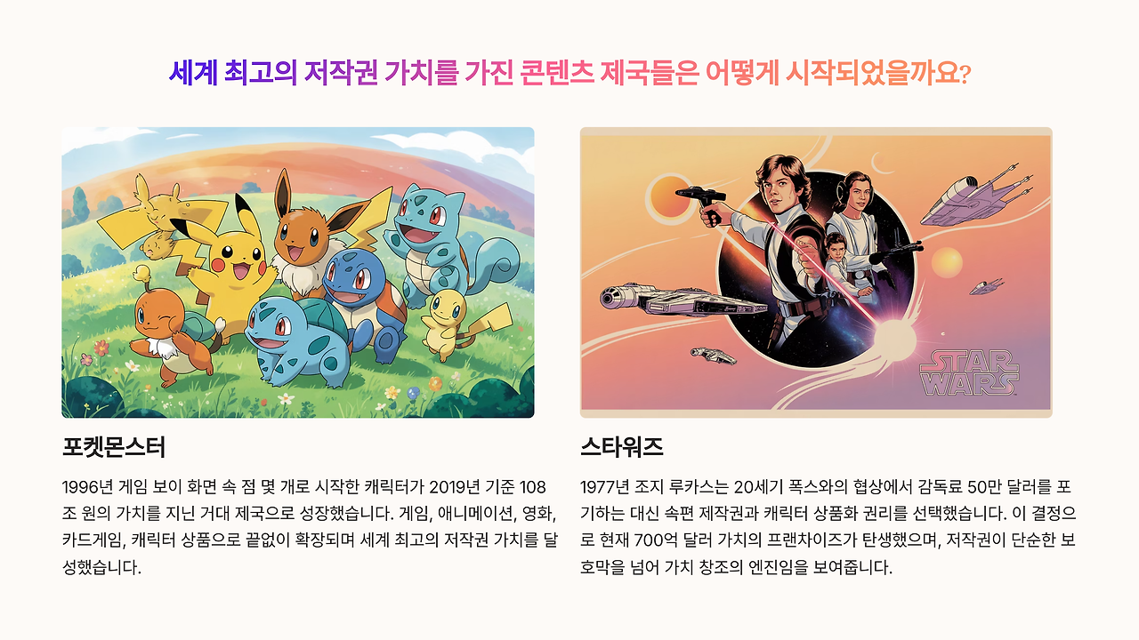 세상에서 가장 비싼 저작권은 무엇일까요? 2024년 기준 130조 원의 가치를 자랑하는 포켓몬스터가 대표적입니다. 1996년 게임보이 화면 속 점 몇 개로 시작한 캐릭터가 게임, 애니메이션, 영화, 카드게임, 캐릭터 상품으로 끝없이 확장되며 거대한 미디어 제국을 건설했습니다.