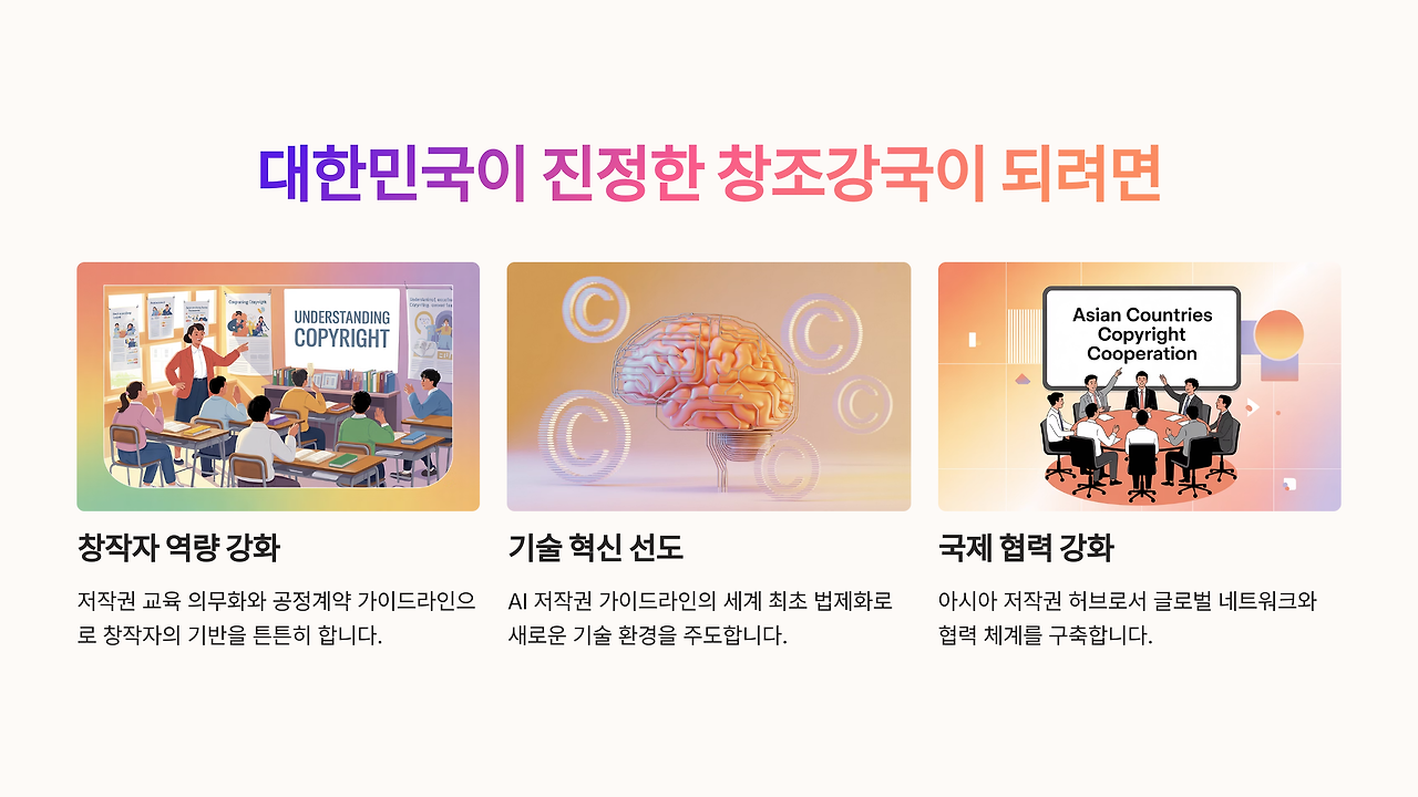 대한민국이 진정한 창조강국이 되려면 세 가지 전략이 필요합니다. 첫째, 저작권 교육 의무화와 공정계약 가이드라인으로 창작자 역량을 강화해야 합니다. 둘째, AI 저작권 가이드라인의 세계 최초 법제화로 기술 혁신을 선도해야 합니다. 셋째, 아시아 저작권 허브로서 국제 협력을 강화해야 합니다.