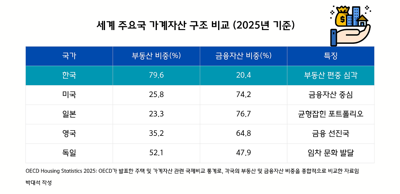 한국의 가계자산 구조는 전 세계적으로도 매우 이례적이다. 한국의 가계자산 중 부동산 비중은 79.6%로 미국의 25.8%와 극명한 대비를 보인다. 금융자산 비중은 한국이 20.4%에 불과한 반면 선진국들은 60% 이상을 유지하고 있다.