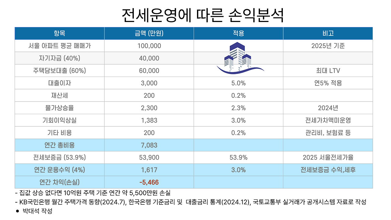 2025년 기준, 집값이 오르지 않는 상황에서 10억 원 가치의 집을 전세로 운영하면 연간 약 5,500만 원의 손실이 발생한다. 이는 대출이자, 재산세 등 비용이 전세보증금 운용수익을 크게 초과하기 때문이다. 집값 상승 기대가 약해지면서 집주인은 전세 대신 월세나 반전세로 임대 방식을 전환하고 있다. 실제로 서울·수도권 전세 매물은 전년 대비 20% 감소했고, 거래량도 줄었다.