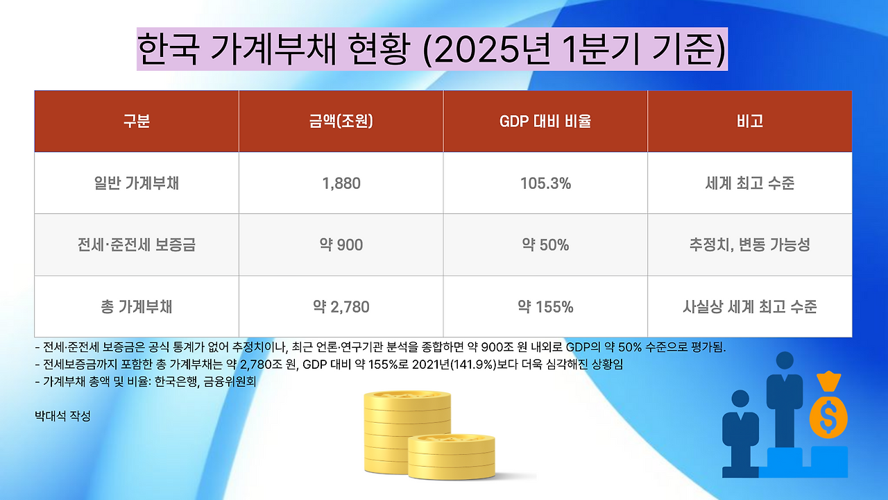 2024년 2분기 한국의 GDP 대비 가계부채는 91%로 여전히 세계 최고 수준이다. 미국의 70.7%와 비교하면 20%포인트나 높다. 더 심각한 것은 가계부채 증가 속도다. 주택담보대출을 중심으로 한 가계부채는 매년 수십조원씩 증가하며 가계의 재정 건전성을 위협하고 있다.