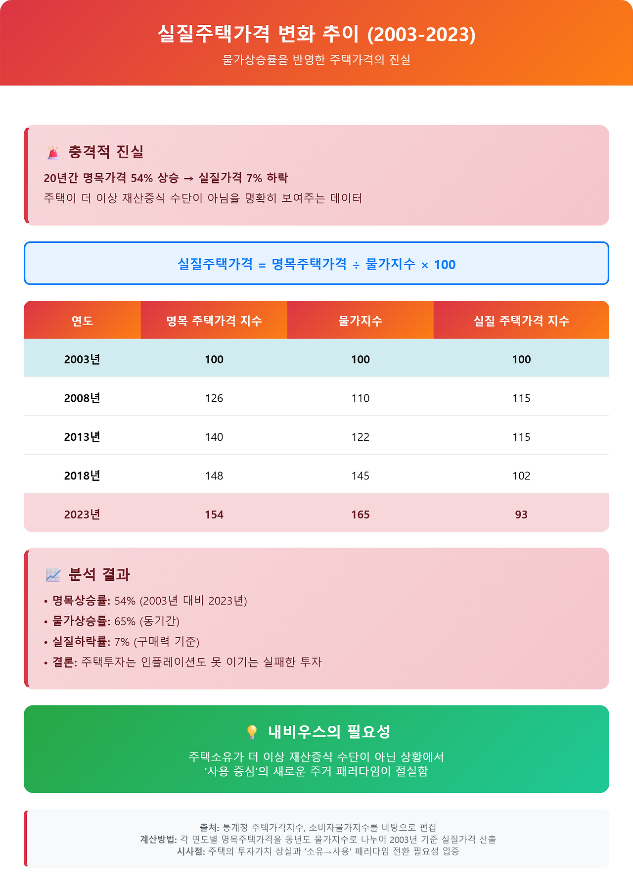 물가상승률을 반영한 실질주택가격은 2003년 대비 93% 수준으로 떨어졌다. 지난 20년간 명목상으로는 주택가격이 상승했지만, 실질 구매력 기준으로는 오히려 하락한 것이다. 이는 부동산이 재산증식 수단에서 재산감소 요인으로 전환되었음을 의미한다.