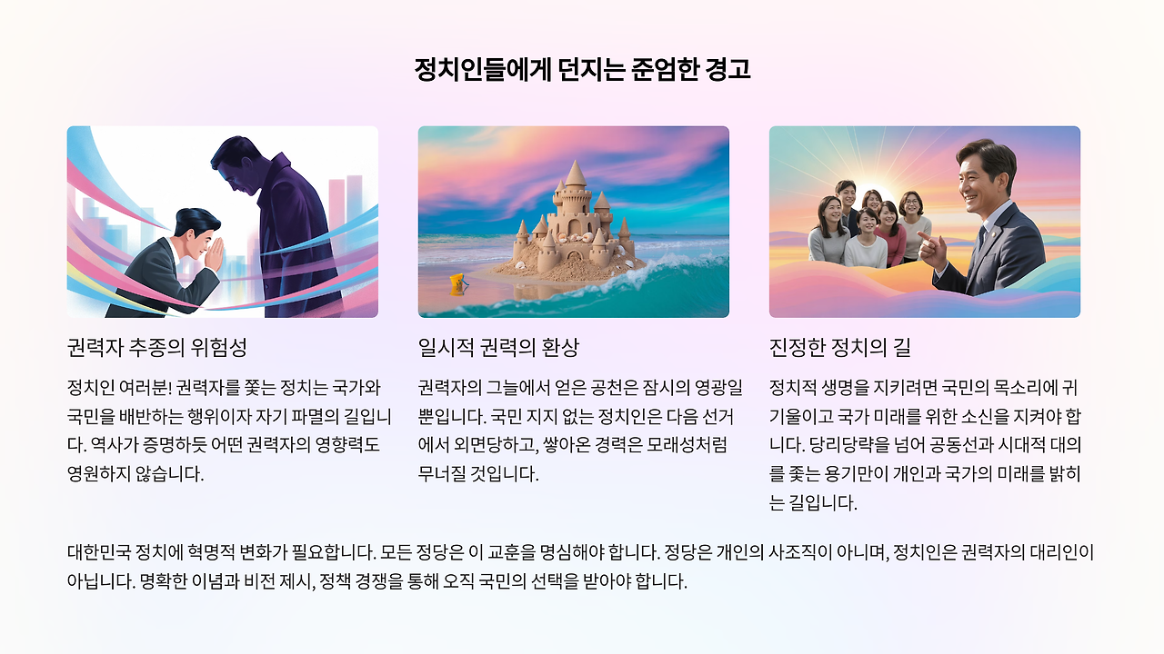 정치인, 그리고 정치 지망생 여러분! 권력자를 쫓아가는 정치는 국가와 국민을 배반하는 행위를 넘어 궁극적으로 자기 파멸로 이끄는 가장 어리석은 선택이다. 역사가 증명하듯 특정 권력자의 해와 달은 영원하지 않다. 그 권력이 기울어지는 순간, 권력자의 심기만 살피며 소신을 잃었던 정치인은 지지 기반을 잃고 참담한 정치적 단명에 이를 수밖에 없다.