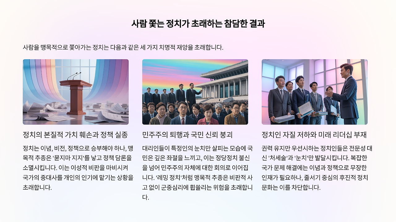 이러한 '사람 쫓는 정치'는 세 가지 치명적인 재앙을 불러온다. 첫째는 정치의 본질적 가치 훼손과 정책 실종이다. 정치는 이념과 비전, 현실적 대안을 담은 정책으로 승부해야 한다. 그러나 특정 인물에 대한 맹목적 추종은 '묻지 마 지지'를 낳고, 심도 있는 정책 담론을 사라지게 만든다. 맹목적 추종은 이성적 비판을 마비시킨다. 정치가 얕고 가벼워지며, 국가의 중대사를 개인의 인기와 운에 맡기는 지경에 이른다.
