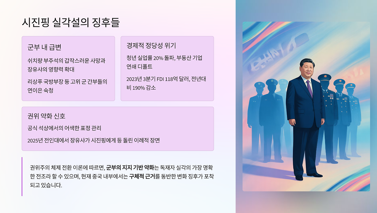 특히 그의 사망과 동시에 장유샤 중앙군사위원회 부주석이 공안부와 국가안전부 등 정치·사법 체계로까지 영향력을 확대하고 있다는 점은 주목할 만하다. 리상푸 국방부장을 비롯한 고위 군 간부들의 연이은 숙청과 함께, 이는 시진핑의 군부 통제력에 균열이 생기고 있음을 보여주는 결정적 신호다. 권위주의 체제 전환 이론에 따르면, 군부의 지지 기반 약화는 독재자 실각의 가장 명확한 전조라 할 수 있다.