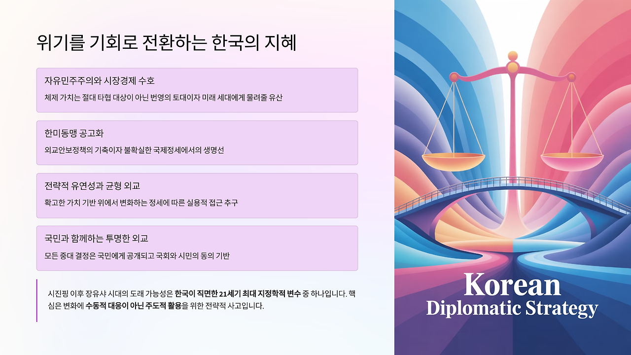 역사는 준비된 자에게 기회를 주며, 지혜로운 선택을 한 민족에게 번영을 안겨준다. 중국 정치의 불투명성을 인정하면서도, 여러 시나리오에 대한 철저한 준비와 원칙에 기반한 유연한 대응이야말로 지금 우리에게 필요한 지혜다.