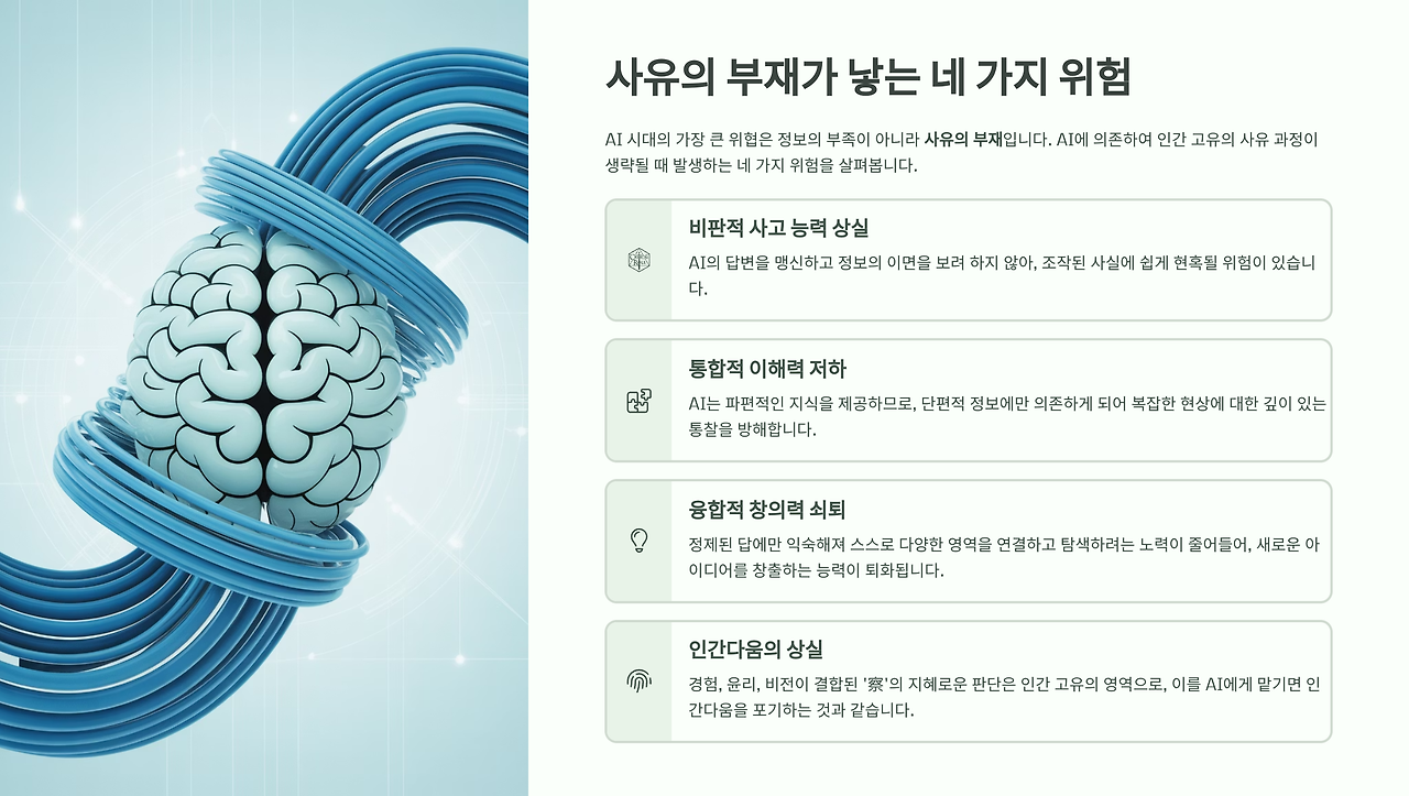 AI 시대의 가장 큰 위협은 정보의 부족이 아니라 사유의 부재다. 우리는 이제 궁금한 것이 생기면 굳이 직접 찾아보거나 고민할 필요 없이 AI에게 묻는다. AI는 놀라운 속도로 가장 '정확해 보이는' 답변을 내놓지만, 그 과정에서 인간은 탐색과 해석, 그리고 판단이라는 핵심적인 사유 과정을 생략하게 된다.