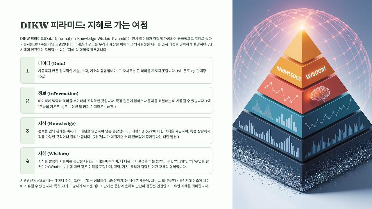 현대 정보학의 DIKW 피라미드는 시견관찰의 현대적 타당성을 증명한다. 원시 데이터(Data)가 맥락을 가진 정보(Information)로 가공되고, 이것이 체계적으로 구조화되어 지식(Knowledge)이 되며, 최종적으로 경험과 윤리가 결합된 지혜(Wisdom)에 이르는 과정은 시견관찰의 네 단계와 정확히 일치한다.