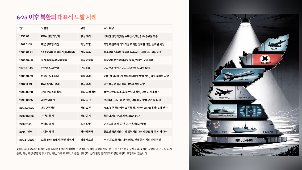 북한은 지난 75년간 대한민국을 상대로 1,500건 이상의 크고 작은 도발을 감행해 왔다. 6·25 전쟁으로 시작해서 1968년 1·21 청와대 습격사건, 1976년 판문점 도끼만행사건, 1987년 KAL기 폭파사건, 2010년 천안함 폭침과 연평도 포격에 이르기까지 북한의 적대 행위는 일관되게 지속되어 왔다. 이런 명백한 현실을 외면하고 '위협'이라는 모호한 개념으로 대체하는 것은 군의 경계태세와 장병의 대적관 확립에 부정적 영향을 미칠 것이다.