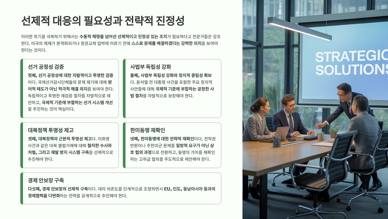 한국이 선택해야 할 길은 명확하다. 변명과 해명에 매달리는 수동적 대응이 아니라, 스스로 문제를 해결하겠다는 적극적이고 당당한 자세를 보여야 한다. 이는 단순히 미국의 눈치를 보는 것이 아니라, 진정한 자유민주주의 국가로서의 품격을 지키는 길이다.