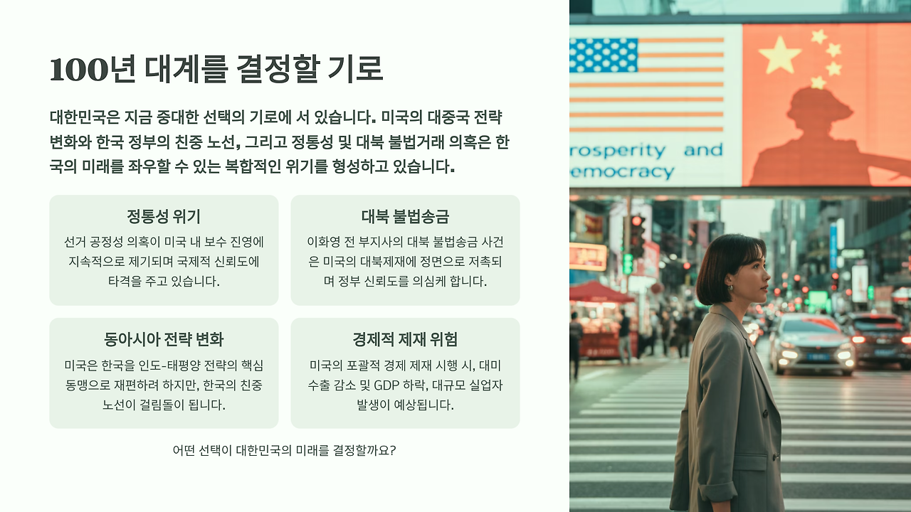 현재 한국이 직면한 상황은 선거 공정성 논란, 정치적 탄압 의혹, 대북 불법거래 연루, 친중 정책 추진이라는 네 가지 위험 요소가 동시에 존재한다는 점에서 베네수엘라보다 더 강력한 제재 명분을 제공할 수 있다.
