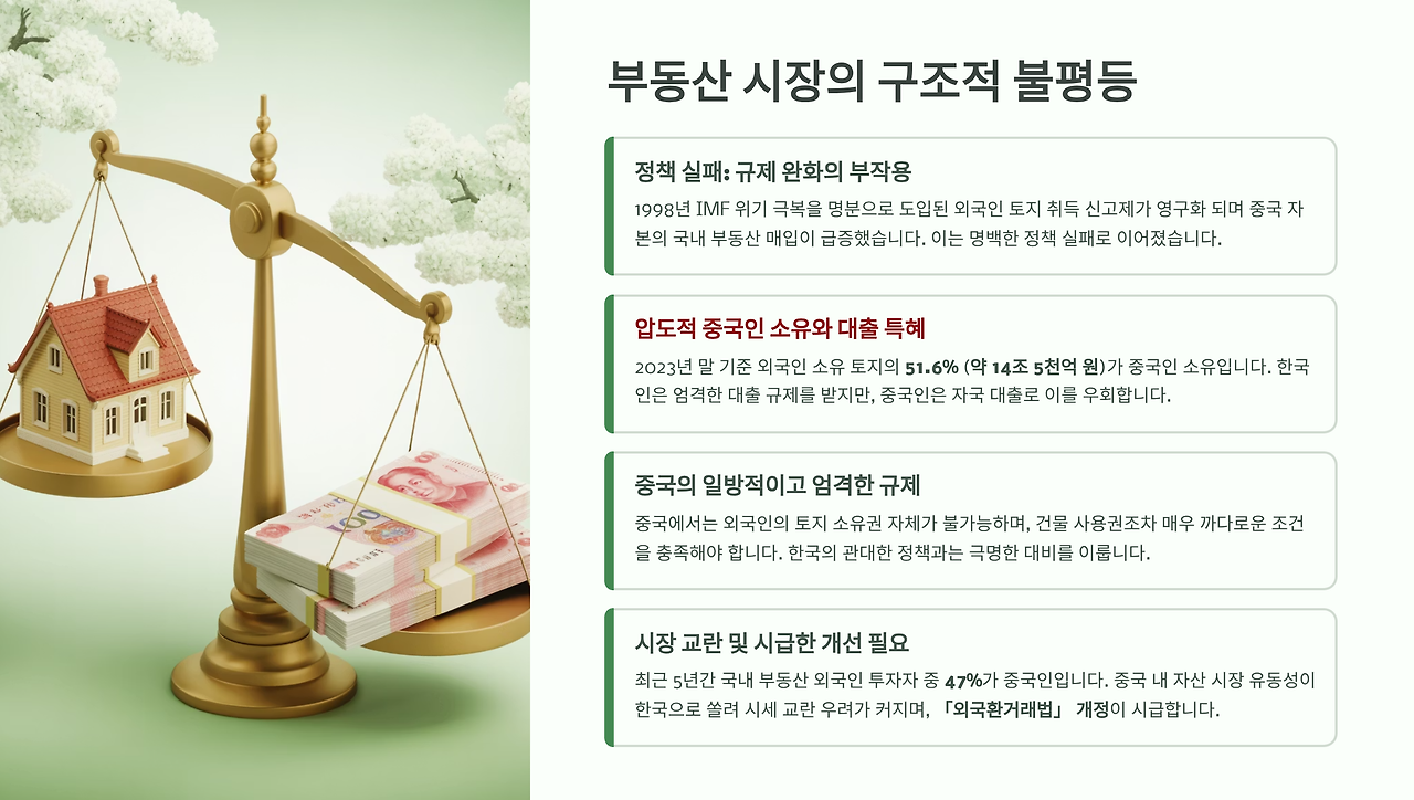 최근 5년간 서울 등 국내 부동산에 투자한 외국인 중 47%가 중국인이라는 통계는 이 불평등의 심각성을 보여준다. 중국 내 자산시장 수익률 하락과 과잉 유동성이 한국 부동산 시장으로 쏠리면서 시세 교란 우려까지 커지고 있다.