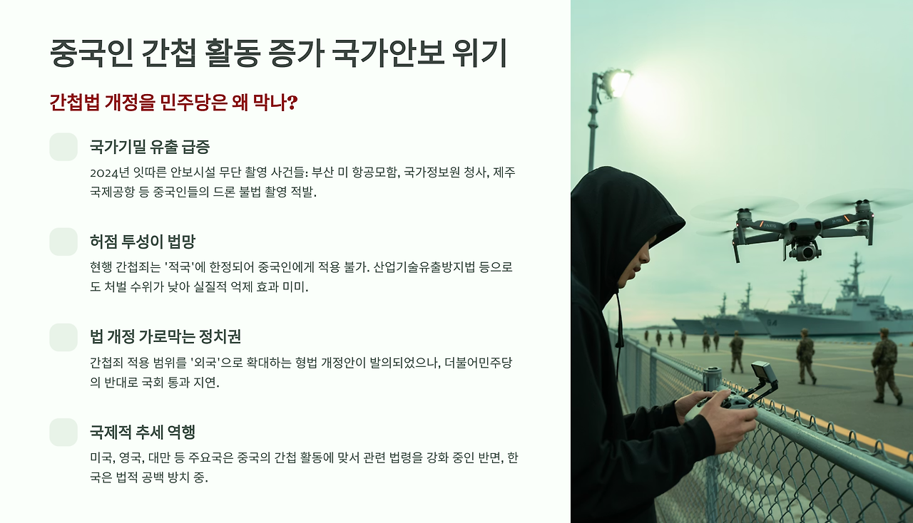 문제는 이런 명백한 간첩 행위에도 불구하고 현행법으로는 제대로 처벌할 수 없다는 점이다. 형법 제98조 간첩죄는 '적국을 위하여 간첩하는 행위'로 규정돼 있어 북한이 아닌 중국인에게는 적용이 불가능하다. 산업기술유출방지법이나 군사기밀보호법으로는 처벌 수위가 낮아 실질적 억제 효과를 기대하기 어렵다.