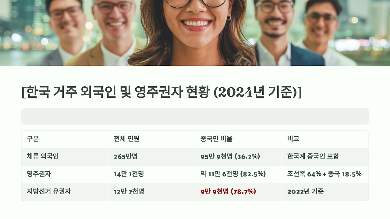 이런 현상이 나타나는 이유는 한국 내 영주권자 구성에서 찾을 수 있다. 2024년 기준 한국의 영주권자 중 중국 국적자(조선족 포함)가 82.5%를 차지한다는 통계가 이를 뒷받침한다. 전체 영주권자 14만 1천여 명 중 조선족이 64%, 중국인이 18.5%를 차지하고 있어 사실상 중국계가 압도적 다수를 이루고 있다.