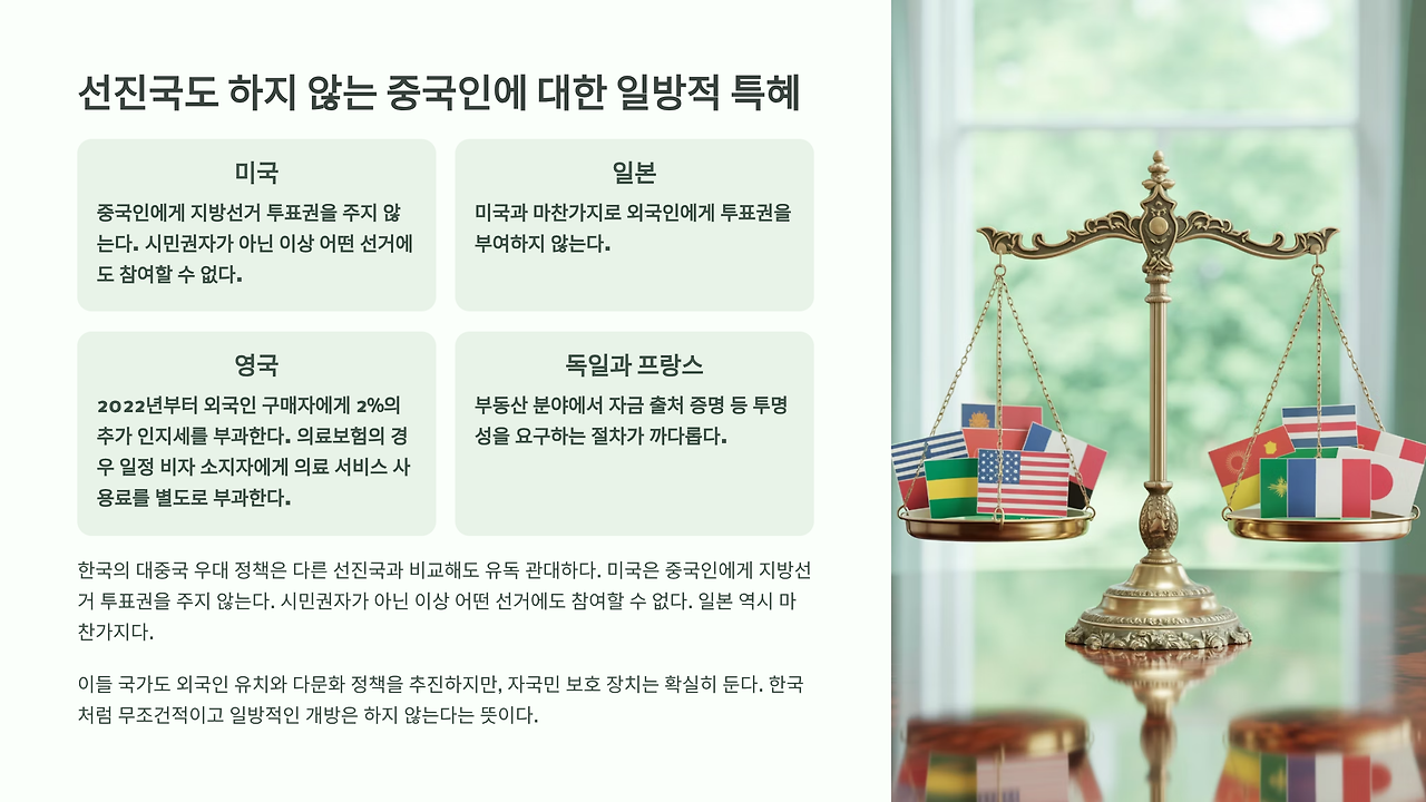 한국의 대중국 우대 정책은 다른 선진국과 비교해도 유독 관대하다. 미국은 중국인에게 지방선거 투표권을 주지 않는다. 시민권자가 아닌 이상 어떤 선거에도 참여할 수 없다. 일본 역시 마찬가지다.