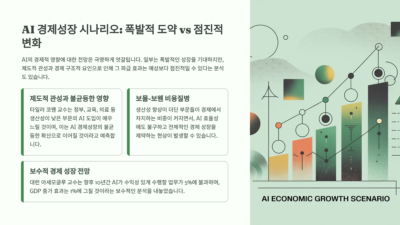 코웬 교수도 "AI가 연간 경제성장률을 0.5% 포인트만 높여도 30-40년에 걸쳐 엄청난 생산성 향상"을 가져올 것이라고 인정한다. 다만 "20년 걸릴 일이 10년에 끝나는" 식의 점진적 변화로 나타날 가능성이 높다는 것이 그의 견해다. 이는 인쇄기나 전기 같은 과거 기술 확산 사례와 유사한 패턴이다.