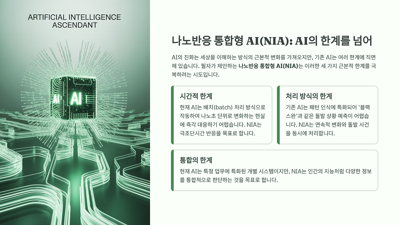 진정한 AI 혁명은 필자가 명명한 '나노반응 통합형 AI(NIA: Nano-Response Integrated AI)'에서 시작될 것이다. NIA는 기존 AI의 세 가지 근본적 한계를 극복하려는 시도다.