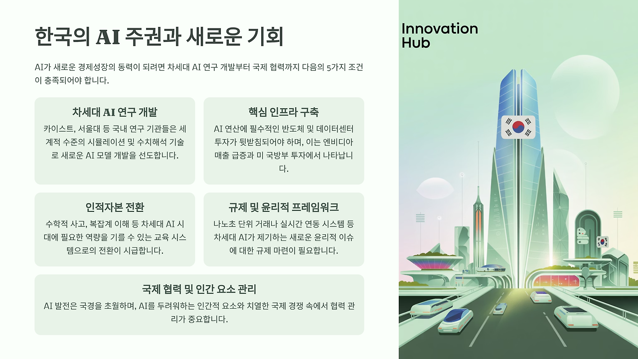 진정한 AI 주권은 남이 만든 도구를 잘 쓰는 것이 아니라, 세상을 이해하는 새로운 방식을 스스로 만드는 것이다. 한국이 TV 하드웨어뿐만 아니라 K-드라마 콘텐츠로도 세계를 정복했듯이, AI 하드웨어 제조국이 아닌 AI 응용 설루션의 글로벌 선도국이 되어야 한다.