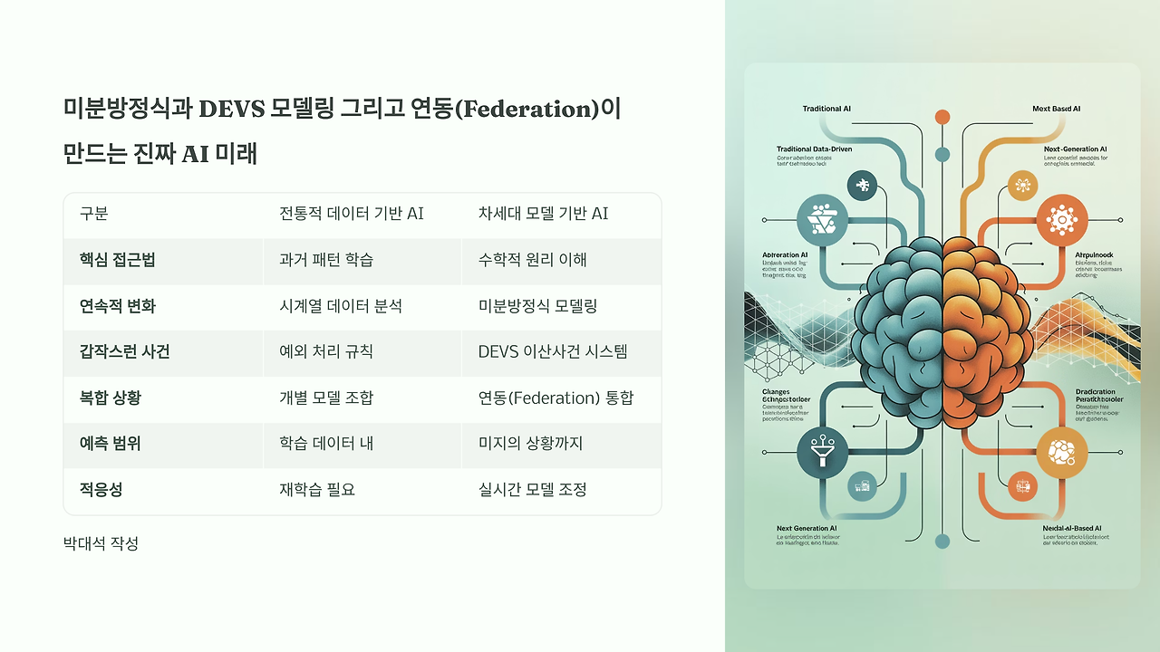 둘째, 처리 방식의 한계다. 기존 AI는 '패턴 인식'에 특화되어 있다. 과거 데이터에서 규칙을 찾아 미래를 예측하는 방식이다. 하지만 2022년 러시아의 우크라이나 침공이나 코로나19 같은 '블랙 스완' 사건은 패턴으로 예측할 수 없다. NIA는 연속적 변화(미분방정식)와 돌발적 사건(DEVS 모델)을 동시에 처리할 수 있도록 설계된다.