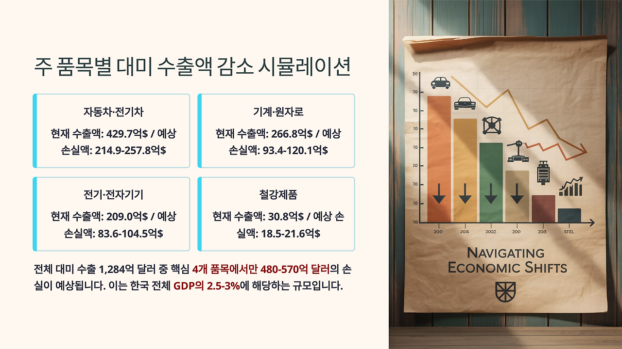 피터슨국제경제연구소와 한국무역협회 분석을 바탕으로 한 시뮬레이션에 따르면, 25% 관세 부과 시 주요 품목별 수출 감소가 예상된다. 자동차와 전기차는 현재 429억 7천만 달러에서 50-60% 감소해 214억 9천만에서 257억 8천만 달러의 손실이 예상된다. 기계와 원자로는 266억 8천만 달러에서 35-45% 감소, 전기전자기기는 209억 달러에서 40-50% 감소할 것으로 추정된다. 철강제품은 30억 8천만 달러에서 60-70%나 급감할 것으로 예상된다.