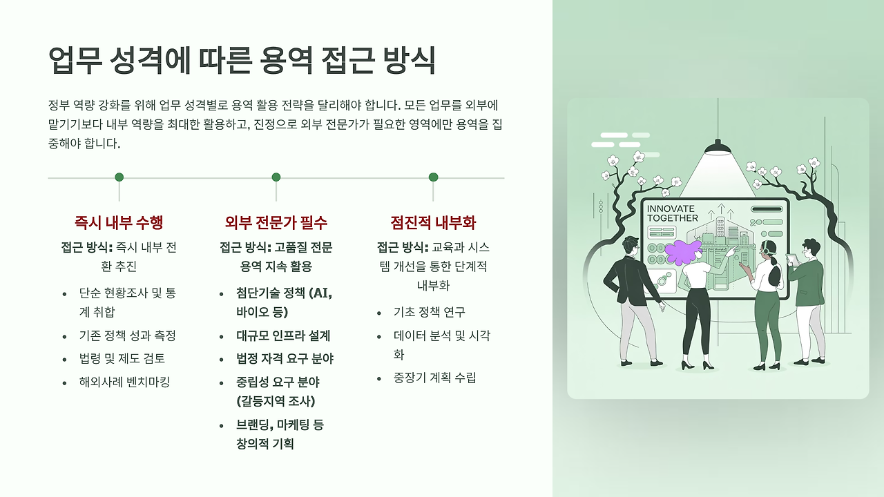 중요한 것은 이런 분야에서는 오히려 더 많은 예산을 투입해서라도 최고 수준의 외부 전문가를 활용해야 한다는 점이다. 무조건적인 용역 축소가 아니라 꼭 필요한 분야에 선별적으로 집중하는 전략적 접근이 필요하다.