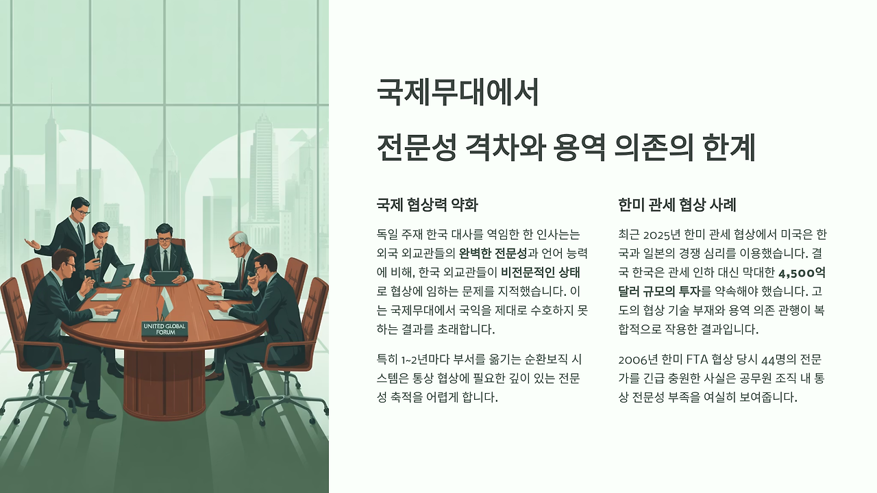 용역 보고서로는 상대방이 실시간으로 구사하는 고도의 협상 기술에 대응할 수 없다. 통상협상은 복잡한 국제 규범과 경제학적 지식, 산업별 특성에 대한 깊이 있는 이해가 필요한 고도의 전문 영역인데, 1-2년마다 부서를 옮기는 순환보직 시스템 하에서는 이런 전문성을 축적할 수 없다. 그 결과 상대방의 전문성과 협상 기술에 밀려 국익을 제대로 보호하지 못하는 상황이 반복되고 있다.