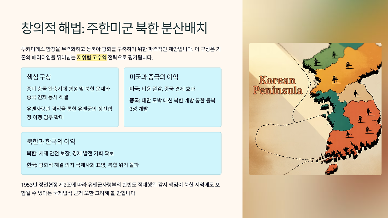 이 구상의 핵심은 투키디데스 함정 자체를 무력화하는 것이다. 중국과 미국이 직접 충돌하지 않도록 완충지대를 만드는 동시에, 북한 문제와 중국 견제를 동시에 해결하는 것이다. 유엔사령관이 주한미군사령관을 겸직한다는 점에서 유엔군의 정전협정 이행 임무 확대라는 명분도 있다.